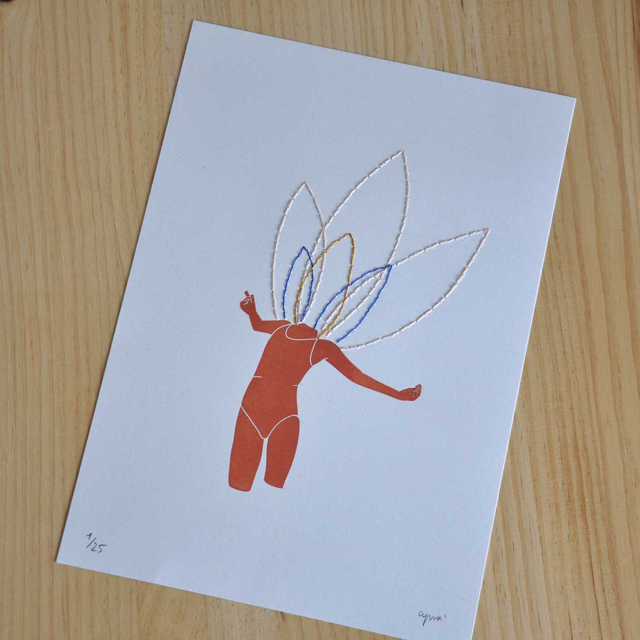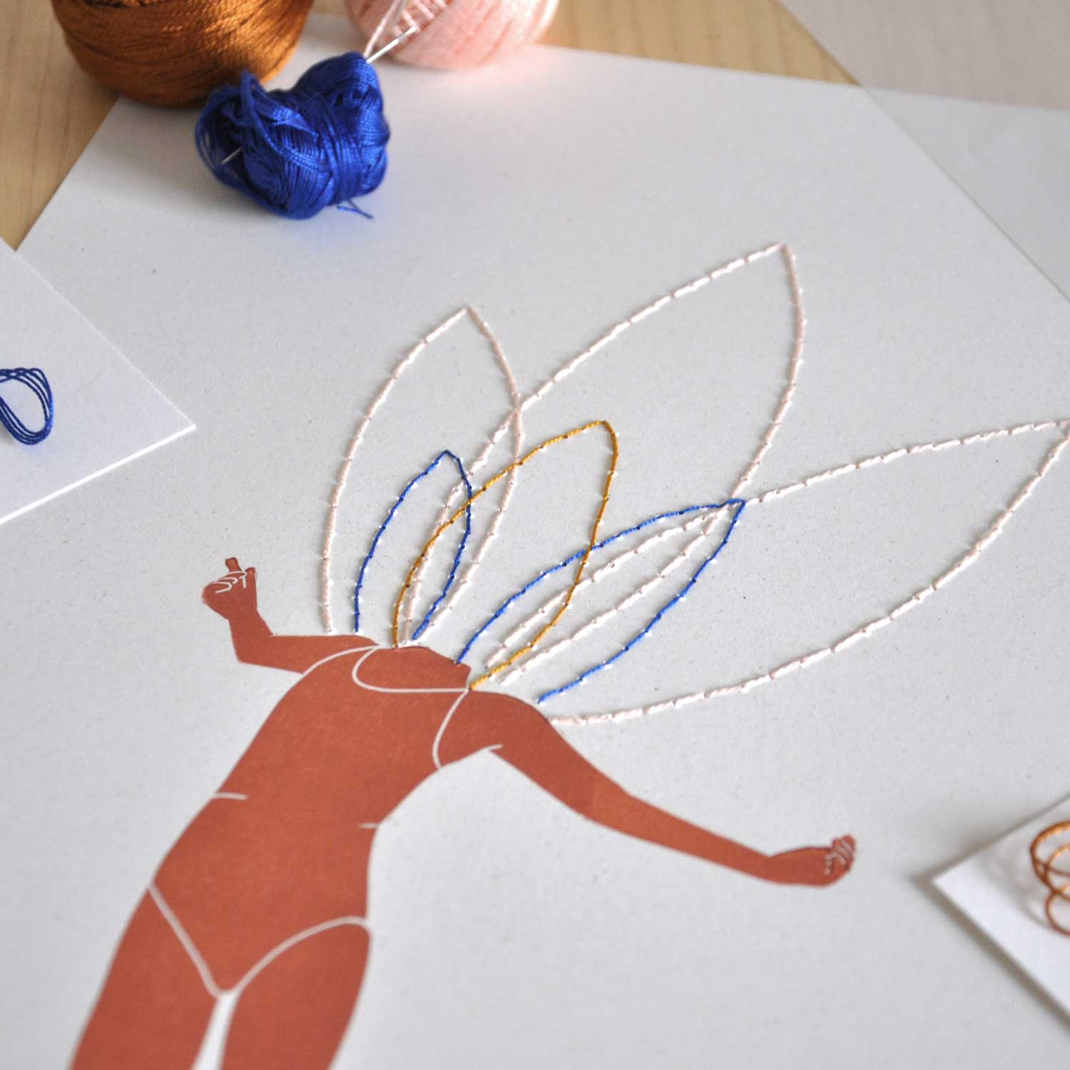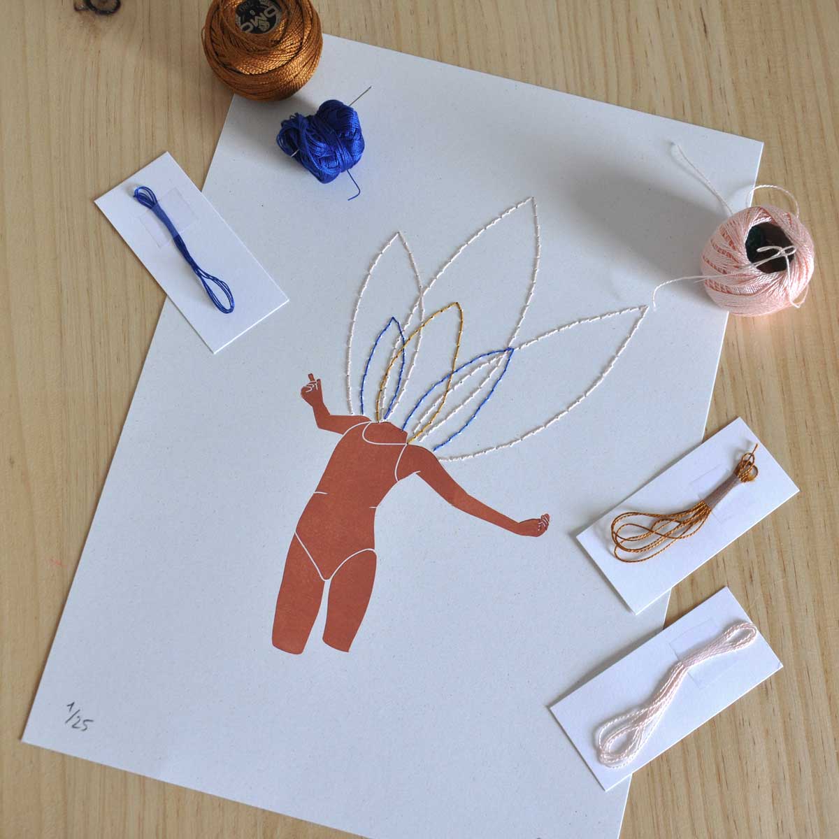The collection Embroidered Ballerinas is a series of 4 one-ink linocuts that celebrate movement, expression and freedom through dance. Each piece has been hand-stamped and intervened with hand embroidery, combining two artistic techniques to create a unique work full of symbolism.