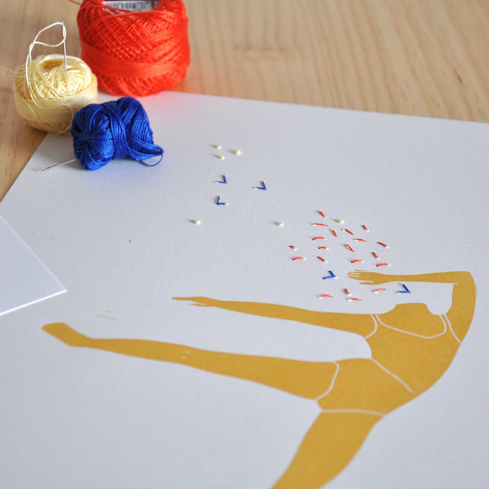 These sheets combine the relief linocut, a traditional engraving technique, with the hand embroidery, adding texture and visual and emotional depth. The thread follows the body and gesture of each dancer, giving a new dimension to the printed movement.