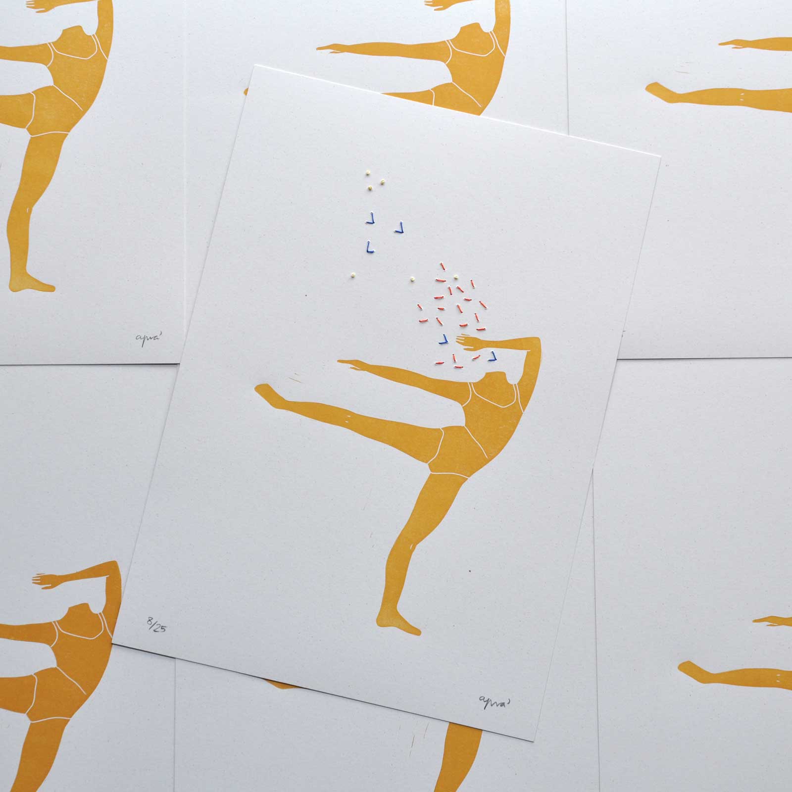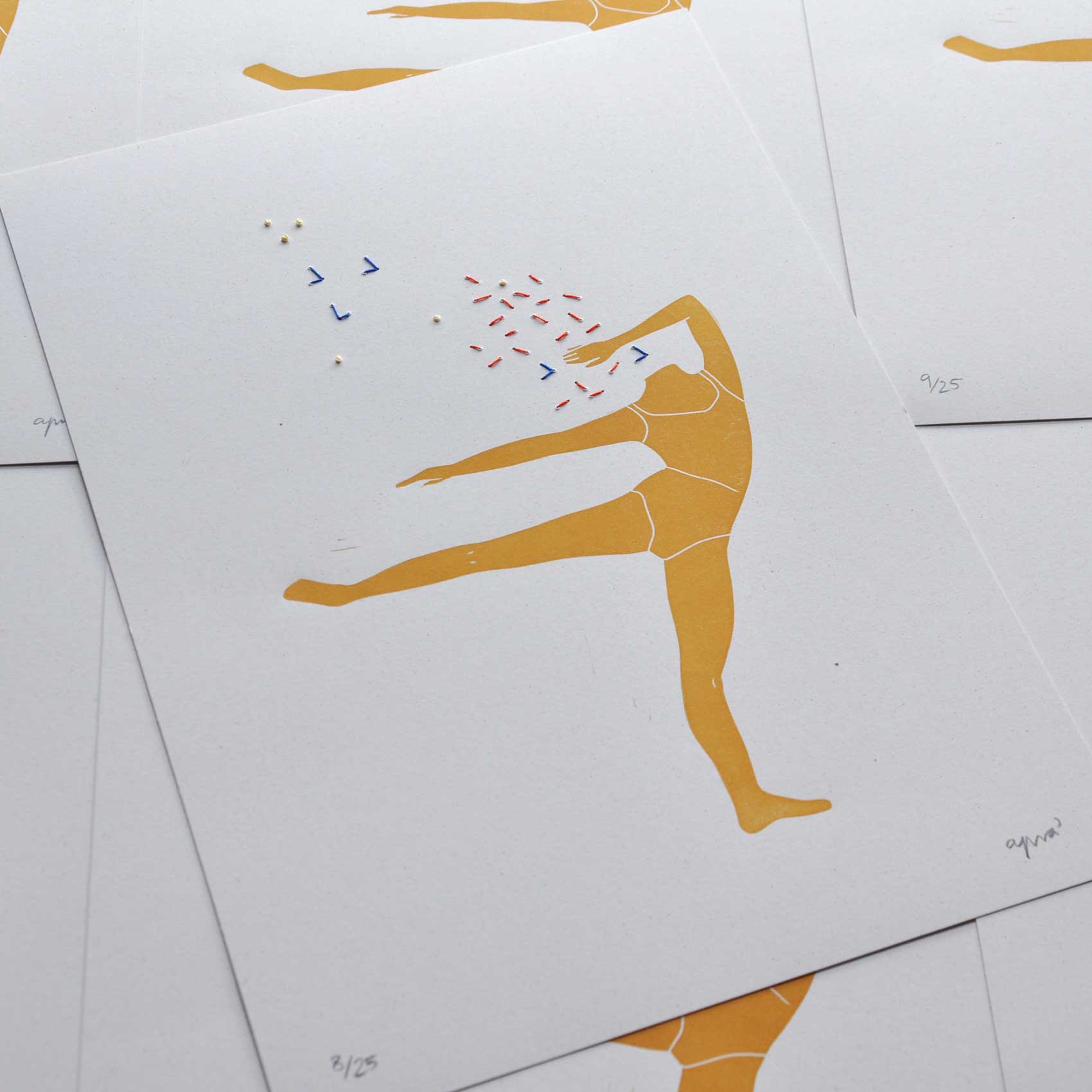 The collection Embroidered Ballerinas is a series of 4 one-ink linocuts that celebrate movement, expression and freedom through dance. Each piece has been hand-stamped and intervened with hand embroidery, combining two artistic techniques to create a unique work full of symbolism.